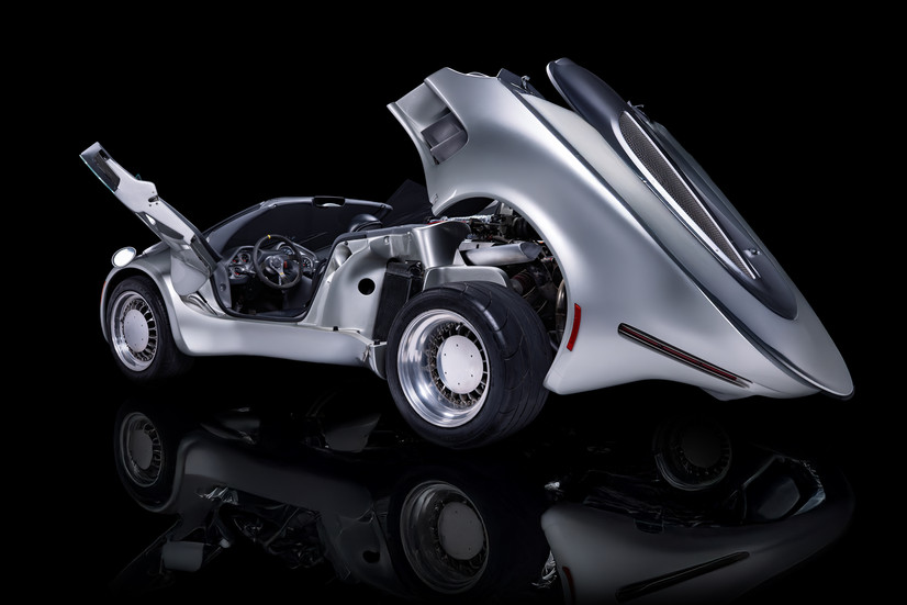 Aircraft-inspired styling cues include a “pointed” nose, wraparound windshield, fixed side windows, and a clamshell rear that reveals the engine. Inside, the two-seat cockpit is outfitted with racing harnesses and a well-equipped dash, remarkable for a one-off vehicle.